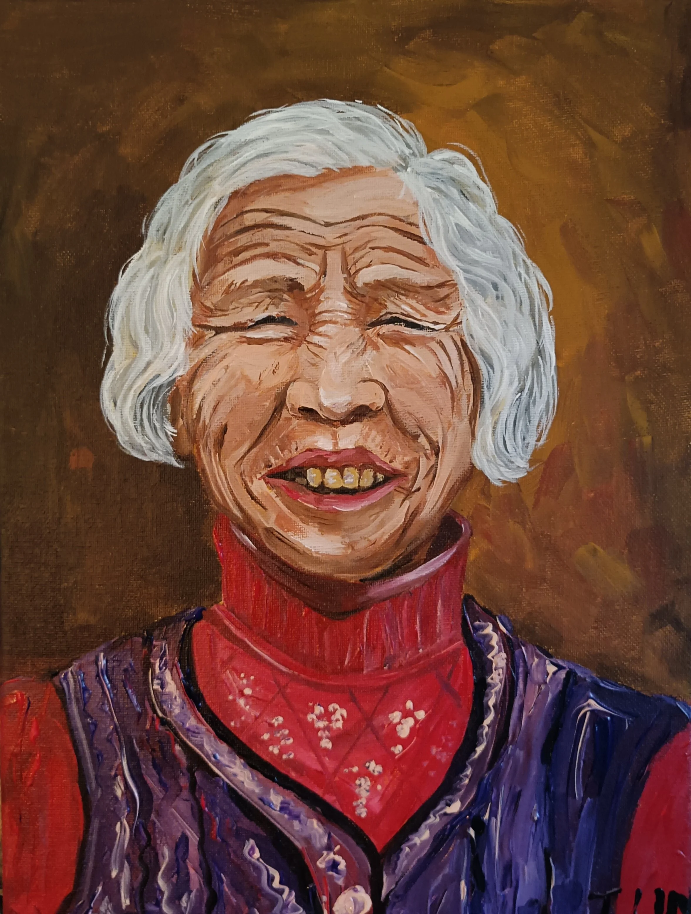 My grandmother was born in 1940 in China. Her husband was a member of the People's Liberation Army and she had five children. Unfortunately, her husband died of illness when she was forty years old, and their oldest child was eighteen and the youngest was only six. She was left alone to bring up her five children against all odds. Only she knows how hard and difficult it was for her. Fortunately, her children are now very filial to her, and each of them is by her side. My grandmother never went to school and was completely illiterate because of the social and personal family circumstances at the time, but the Bible is the only book she could read. She was a devout Christian. She always had a smile on her face, a smile of peace and love, and her smile was so warm and unhurried. I loved the way she smiled. My grandmother taught me to be strong and independent and gentleness.